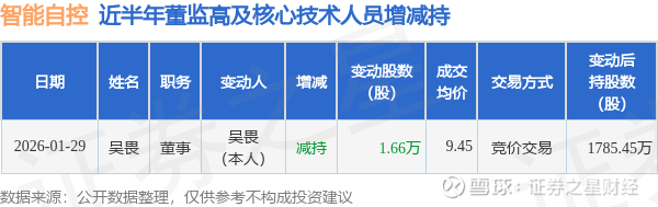智能自控近半年内的董监高及核心技术人员增减持详情如下: