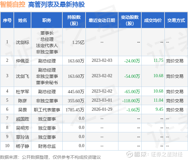 智能自控的高管列表及最新持股情况如下: