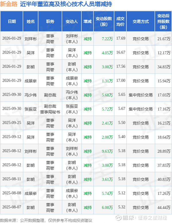 新金路近半年内的董监高及核心技术人员增减持详情如下: