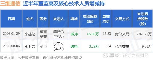 三维通信近半年内的董监高及核心技术人员增减持详情如下:
