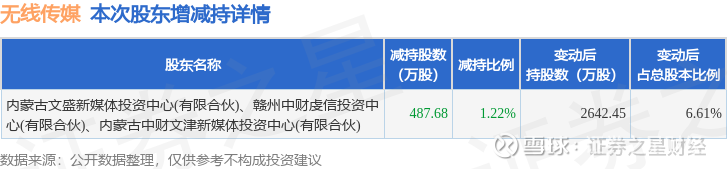 证券之星消息,1月30日无线传媒发布公告《无线传媒:关于持股5%以上股东权益变动触及1%整数倍的公告》,其股东内蒙古文盛新媒体投资中心(有限合伙)、赣州中财虔信投资中心(有限合伙)、内蒙古中财文津新媒体投资中心(有限合伙)于2026年1月13日至2026年1月29日间合计减持487.68万股,占公司目前总股本的1.2192%,变动期间该股股价上涨1.13%,截止1月29日收盘报36.71元。