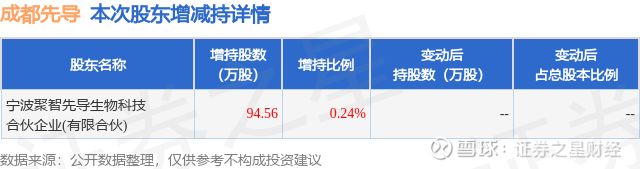 证券之星消息,1月30日成都先导发布公告《成都先导:成都先导药物开发股份有限公司关于控股股东、实际控制人之一致行动人宁波聚智先导生物科技合伙企业(有限合伙)增持公司股份计划实施完毕暨增持结果公告》,其股东宁波聚智先导生物科技合伙企业(有限合伙)于2025年10月13日至2026年1月30日间合计增持94.56万股,占公司目前总股本的0.236%,变动期间该股股价上涨31.82%,截止1月30日收盘报31.11元。