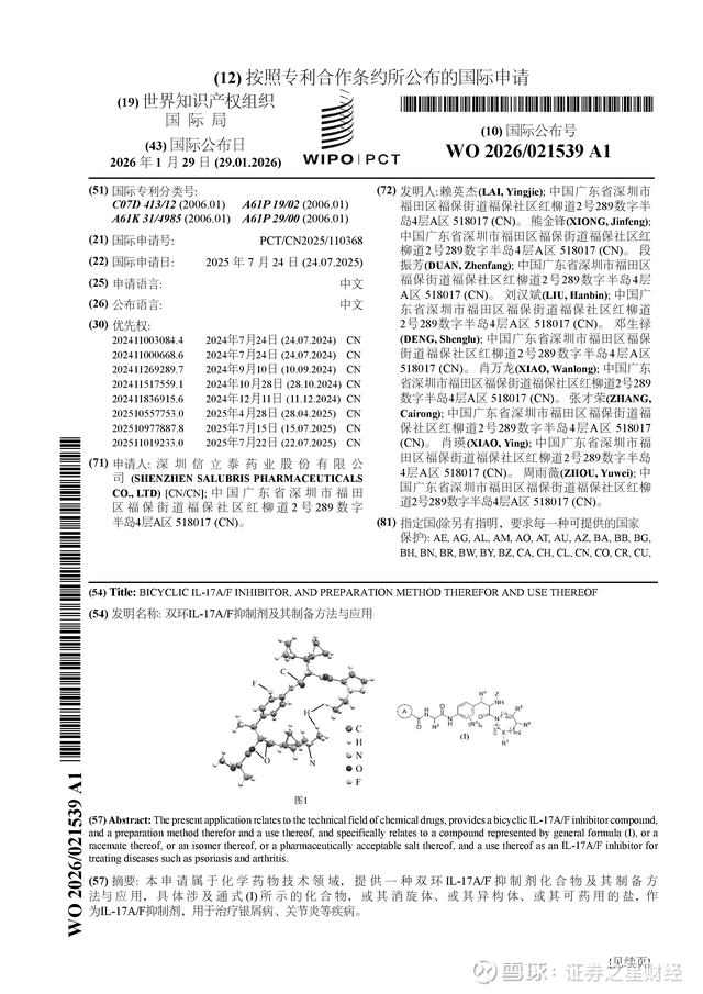 证券之星消息,根据企查查数据显示信立泰(002294)公布了一项国际专利申请,专利名为“双环IL-17A/F抑制剂及其制备方法与应用”,专利申请号为PCT/CN2025/110368,国际公布日为2026年1月29日。