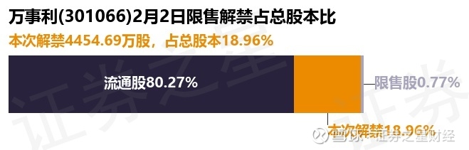 证券之星消息,根据市场公开信息整理,万事利(301066)于2月2日将有4454.69万股限售股份解禁,为公司定向增发机构配售股份,占公司总股本18.96%。(本次数据根据历史公告整理得出,实际情况以上市公司最新公告为准)本次解禁后,公司还有180.64万股限售股份,占总股本0.77%。具体如下图所示: