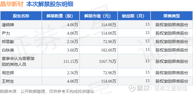 证券之星消息,根据市场公开信息整理,晶华新材(603683)于2月2日将有131.87万股限售股份解禁,为公司股权激励限售股份,占公司总股本0.45%。(本次数据根据历史公告整理得出,实际情况以上市公司最新公告为准)最近一年内,该股累计解禁2719.98万股,占总股本的9.37%。本次解禁后,公司还有310.19万股限售股份,占总股本1.07%。具体如下图所示: