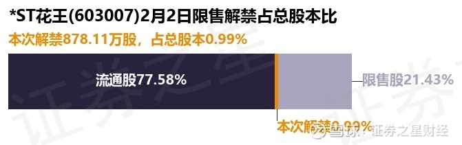 证券之星消息,根据市场公开信息整理,*ST花王(603007)于2月2日将有878.11万股限售股份解禁,为公司其他类型,占公司总股本0.99%。(本次数据根据历史公告整理得出,实际情况以上市公司最新公告为准)最近一年内,该股累计解禁1.86亿股,占总股本的21.08%。本次解禁后,公司还有1.9亿股限售股份,占总股本21.43%。具体如下图所示:
