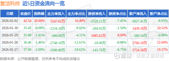 证券之星消息,复洁科技2月2日涨停收盘,收盘价42.54元。该股于11点18分涨停,未打开涨停,截止收盘封单资金为1.7万元,占其流通市值0.0%。