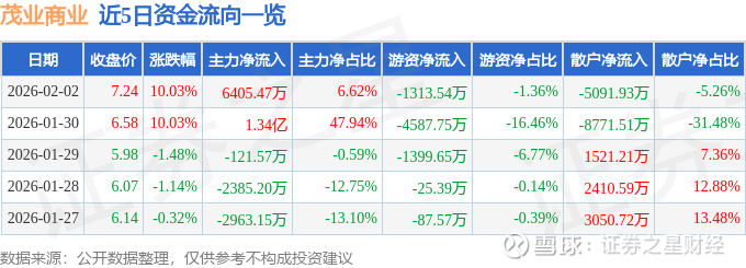 2月2日的资金流向数据方面,主力资金净流入6405.47万元,占总成交额6.62%,游资资金净流出1313.54万元,占总成交额1.36%,散户资金净流出5091.93万元,占总成交额5.26%。