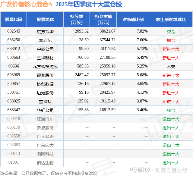 广发价值核心混合A的前十大重仓股如下: