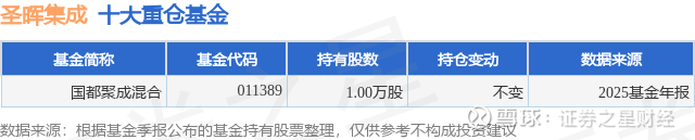 根据2025基金年报公募基金重仓股数据,重仓该股的公募基金共1家,其中持有数量最多的公募基金为国都证券的国都聚成混合。国都聚成混合目前规模为0.11亿元,最新净值0.6425(1月30日),较上一交易日下跌1.77%,近一年上涨31.93%。该公募基金现任基金经理为张晓磊 龚勇进 王义 王实。张晓磊在任的基金产品包括:国都创新驱动,管理时间为2023年3月10日至今,期间收益率为-16.95%;王义在任的基金产品包括:国都创新驱动,管理时间为2025年1月10日至今,期间收益率为45.66%;