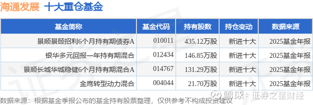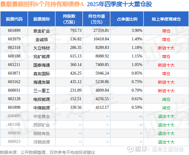 根据2025基金年报公募基金重仓股数据,重仓该股的公募基金共4家,其中持有数量最多的公募基金为景顺长城基金的景顺景颐招利6个月持有期债券A。景顺景颐招利6个月持有期债券A目前规模为62.93亿元,最新净值1.3272(1月30日),较上一交易日下跌0.52%,近一年上涨13.33%。该公募基金现任基金经理为董晗 李怡文 邹立虎。李怡文在任的基金产品包括:景顺长城景颐双利债券A,管理时间为2021年4月30日至今,期间收益率为27.65%;景顺长城安泽回报一年持有混合A,管理时间为2021年4月30日至今,期间收益率为45.72%;景顺景颐嘉利6个月持有期债券A,管理时间为2021年6月16日至今,期间收益率为25.87%。董晗在任的基金产品包括:景顺长城景颐双利债券A,管理时间为2020年10月30日至今,期间收益率为34.22%;景顺景颐嘉利6个月持有期债券A,管理时间为2020年10月30日至今,期间收益率为33.42%;景顺长城景气成长混合A,管理时间为2021年6月15日至今,期间收益率为56.95%。邹立虎在任的基金产品包括:景顺长城安盈回报一年持有混合A,管理时间为2021年11月16日至今,期间收益率为56.52%;景顺长城景盛双息收益债券A,管理时间为2022年1月29日至今,期间收益率为26.18%;景顺长城华城稳健6个月持有期混合A,管理时间为2022年3月12日至今,期间收益率为35.52%。