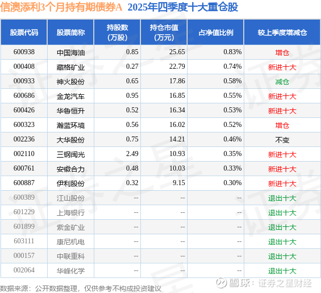 根据2025基金年报公募基金重仓股数据,重仓该股的公募基金共1家,其中持有数量最多的公募基金为信达澳亚基金的信澳添利3个月持有期债券A。信澳添利3个月持有期债券A目前规模为0.31亿元,最新净值1.1395(1月30日),较上一交易日下跌0.21%。该公募基金现任基金经理为易文斐 马俊飞。马俊飞在任的基金产品包括:信澳慧理财货币A,管理时间为2022年12月14日至今,期间收益率为5.18%;信澳优享债券A,管理时间为2022年12月14日至今,期间收益率为8.93%;信澳瑞享利率债A,管理时间为2023年9月5日至今,期间收益率为5.2%;信澳稳鑫债券A,管理时间为2023年12月26日至今,期间收益率为5.64%。