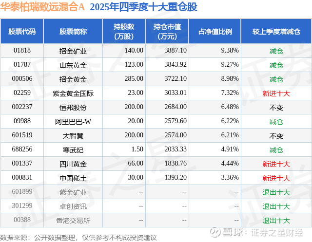 根据2025基金年报公募基金重仓股数据,重仓该股的公募基金共5家,其中持有数量最多的公募基金为华泰柏瑞基金的华泰柏瑞致远混合A。华泰柏瑞致远混合A目前规模为1.23亿元,最新净值1.7887(1月30日),较上一交易日下跌4.69%,近一年上涨83.9%。该公募基金现任基金经理为叶丰。叶丰在任的基金产品包括:华泰柏瑞锦瑞债券A,管理时间为2024年6月14日至今,期间收益率为23.06%;华泰柏瑞锦华债券A,管理时间为2025年3月25日至今,期间收益率为4.65%;华泰柏瑞安盛一年持有期债券A,管理时间为2025年7月9日至今,期间收益率为2.92%。