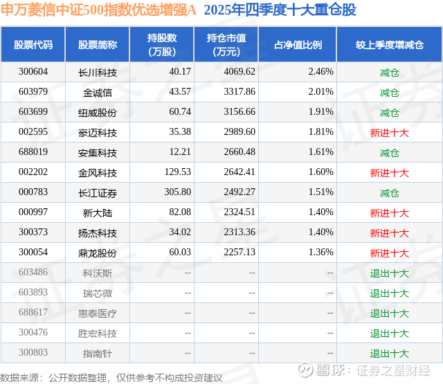 申万菱信中证500指数优选增强A的前十大重仓股如下: