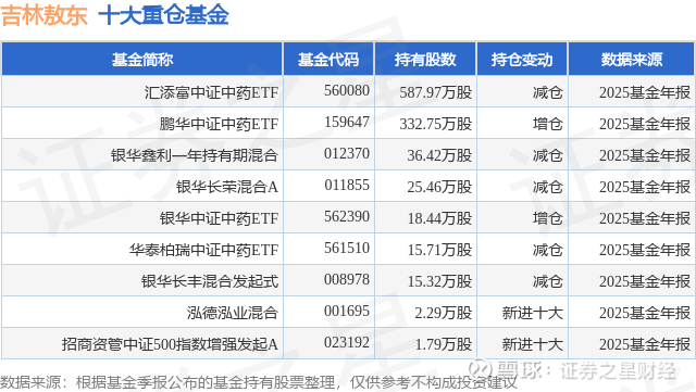 根据2025基金年报公募基金重仓股数据,重仓该股的公募基金共9家,其中持有数量最多的公募基金为汇添富基金的汇添富中证中药ETF。汇添富中证中药ETF目前规模为24.52亿元,最新净值1.0471(1月30日),较上一交易日下跌1.1%,近一年上涨0.92%。该公募基金现任基金经理为过蓓蓓。过蓓蓓在任的基金产品包括:汇添富中证主要消费ETF联接A,管理时间为2015年8月3日至今,期间收益率为108.59%;汇添富中证主要消费ETF,管理时间为2015年8月3日至今,期间收益率为110.53%;汇添富中证医药卫生ETF,管理时间为2015年8月3日至今,期间收益率为-15.04%;汇添富中证生物科技指数(LOF)A,管理时间为2016年12月22日至今,期间收益率为27.59%。