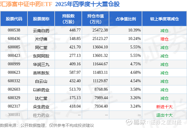 汇添富中证中药ETF的前十大重仓股如下: