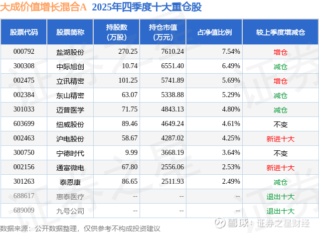 大成价值增长混合A的前十大重仓股如下: