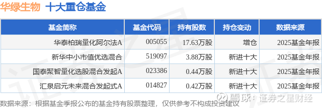 根据2025基金年报公募基金重仓股数据,重仓该股的公募基金共4家,其中持有数量最多的公募基金为华泰柏瑞基金的华泰柏瑞量化阿尔法A。华泰柏瑞量化阿尔法A目前规模为2.93亿元,最新净值1.951(1月30日),较上一交易日上涨1.31%,近一年上涨40.55%。该公募基金现任基金经理为盛豪 孔令烨。盛豪在任的基金产品包括:华泰柏瑞量化优选混合,管理时间为2015年10月13日至今,期间收益率为137.97%;华泰柏瑞量化先行混合A,管理时间为2021年9月17日至今,期间收益率为29.23%;华泰柏瑞中证2000指数增强A,管理时间为2024年1月12日至今,期间收益率为98.54%。孔令烨在任的基金产品包括:华泰柏瑞量化驱动混合A,管理时间为2022年8月5日至今,期间收益率为32.35%;华泰柏瑞中证2000指数增强A,管理时间为2024年1月12日至今,期间收益率为98.54%;华泰柏瑞上证科创板综合指数增强A,管理时间为2025年11月18日至今,期间收益率为10.82%。