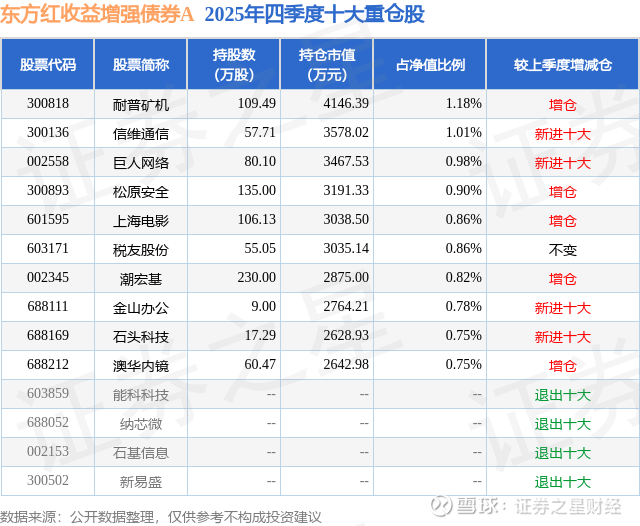 东方红收益增强债券A的前十大重仓股如下: