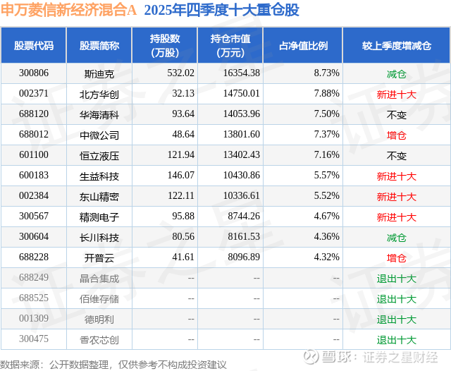 根据2025基金年报公募基金重仓股数据,重仓该股的公募基金共4家,其中持有数量最多的公募基金为申万菱信基金的申万菱信新经济混合A。申万菱信新经济混合A目前规模为11.96亿元,最新净值1.5745(1月30日),较上一交易日下跌0.02%,近一年上涨74.67%。该公募基金现任基金经理为付娟。付娟在任的基金产品包括:申万菱信乐享混合A,管理时间为2021年3月24日至今,期间收益率为65.82%;申万菱信乐同混合A,管理时间为2021年9月6日至今,期间收益率为0.02%;申万菱信乐融一年持有混合A,管理时间为2022年6月17日至今,期间收益率为28.99%。