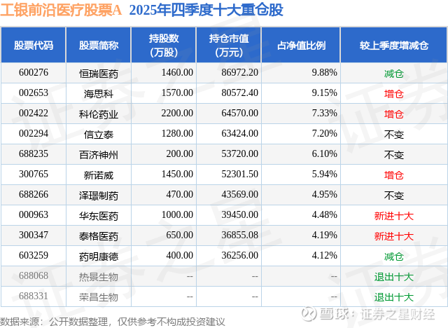 根据2025基金年报公募基金重仓股数据,重仓该股的公募基金共38家,其中持有数量最多的公募基金为工银瑞信基金的工银前沿医疗股票A。工银前沿医疗股票A目前规模为77.77亿元,最新净值3.103(1月30日),较上一交易日下跌1.15%,近一年上涨19.62%。该公募基金现任基金经理为赵蓓。赵蓓在任的基金产品包括:工银医疗保健股票,管理时间为2014年11月18日至今,期间收益率为183.1%;工银养老产业股票A,管理时间为2015年4月28日至今,期间收益率为58.4%;工银成长精选混合A,管理时间为2021年3月25日至今,期间收益率为-27.64%。