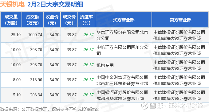 证券之星消息,2月2日天银机电发生大宗交易,交易数据如下:
