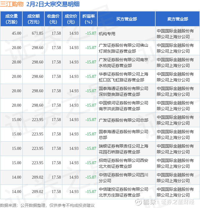 证券之星消息,2月2日三江购物发生大宗交易,交易数据如下: