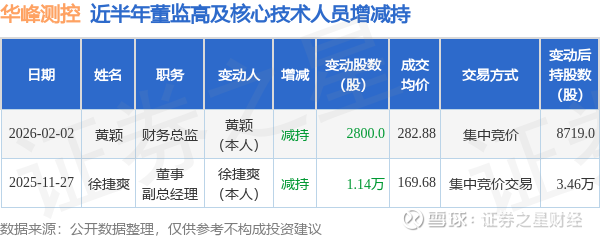 证券之星消息,根据2月2日市场公开信息、上市公司公告及交易所披露数据整理,华峰测控(688200)最新董监高及相关人员股份变动情况:2026年2月2日公司财务总监黄颖共减持公司股份2800.0股,占公司总股本为0.0021%。变动期间公司股价下跌6.54%,2月2日当日收盘报281.57元。