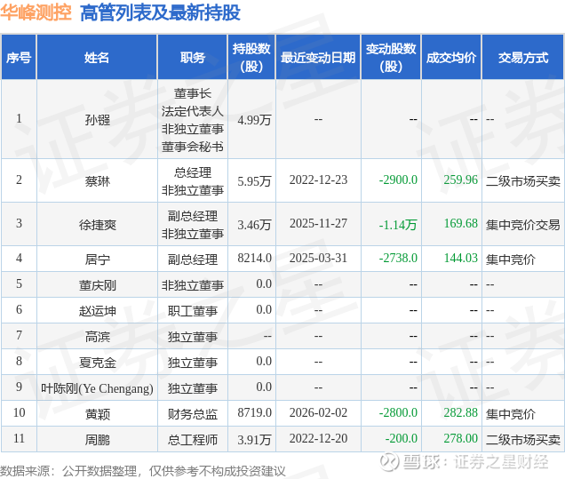 华峰测控的高管列表及最新持股情况如下: