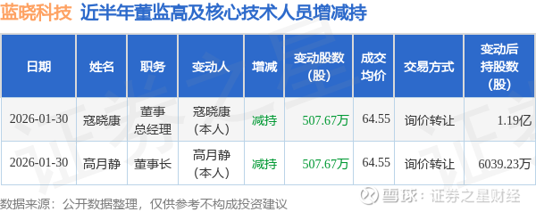 证券之星消息,根据2月2日市场公开信息、上市公司公告及交易所披露数据整理,蓝晓科技(300487)最新董监高及相关人员股份变动情况:2026年1月30日公司董事长高月静、董事,总经理寇晓康共减持公司股份1015.33万股,占公司总股本为1.9942%。变动期间公司股价下跌3.0%,1月30日当日收盘报67.16元。