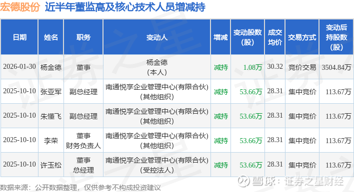 宏德股份近半年内的董监高及核心技术人员增减持详情如下: