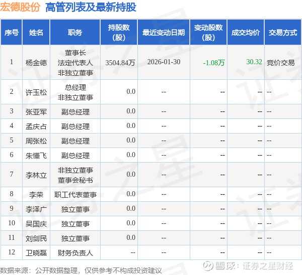 证券之星消息,根据2月2日市场公开信息、上市公司公告及交易所披露数据整理,宏德股份(301163)最新董监高及相关人员股份变动情况:2026年1月30日公司董事杨金德共减持公司股份1.08万股,占公司总股本为0.0132%。变动期间公司股价上涨1.9%,1月30日当日收盘报30.55元。