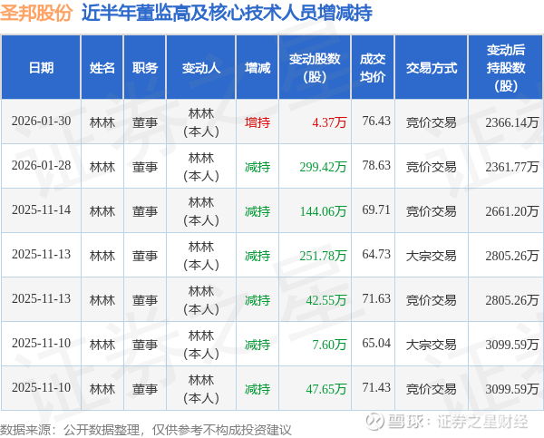圣邦股份近半年内的董监高及核心技术人员增减持详情如下: