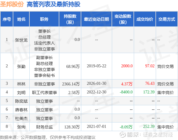 圣邦股份的高管列表及最新持股情况如下: