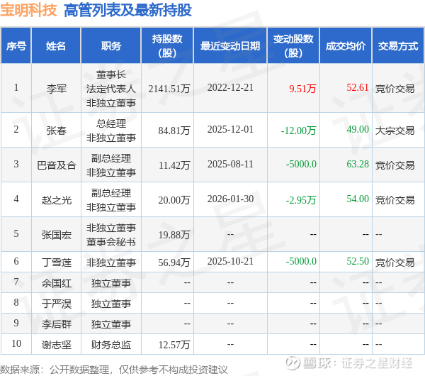 宝明科技近半年内的董监高及核心技术人员增减持详情如下: