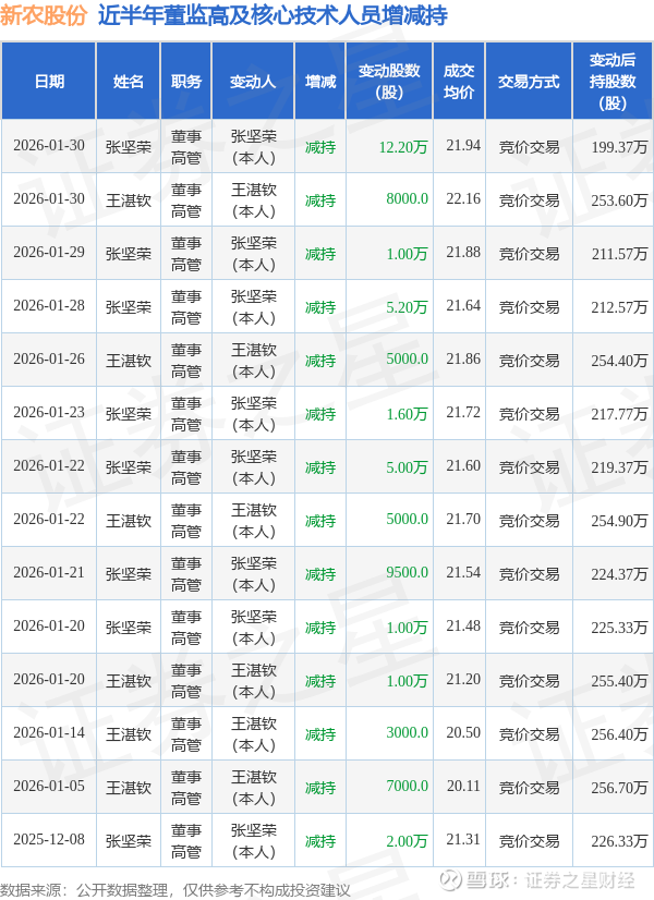 新农股份近半年内的董监高及核心技术人员增减持详情如下: