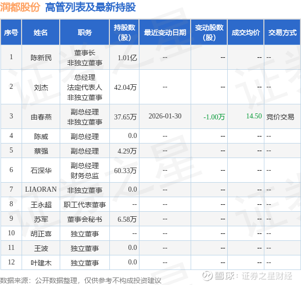 证券之星消息,根据2月2日市场公开信息、上市公司公告及交易所披露数据整理,润都股份(002923)最新董监高及相关人员股份变动情况:2026年1月30日公司董事,高管由春燕共减持公司股份1.0万股,占公司总股本为0.003%。变动期间公司股价上涨5.34%,1月30日当日收盘报14.39元。