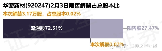 证券之星消息,根据市场公开信息整理,华密新材(920247)于2月3日将有3.17万股限售股份解禁,为公司公开发行原股东限售股份,占公司总股本0.02%。(本次数据根据历史公告整理得出,实际情况以上市公司最新公告为准)本次解禁后,公司还有4327.73万股限售股份,占总股本27.47%。具体如下图所示: