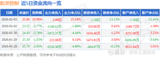 证券之星消息,航发控制2月3日涨停收盘,收盘价25.86元。该股于10点16分涨停,未打开涨停,截止收盘封单资金为1.75亿元,占其流通市值0.51%。