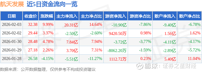 证券之星消息,航天发展2月3日涨停收盘,收盘价32.38元。该股于11点15分涨停,3次打开涨停,截止收盘封单资金为3.96亿元,占其流通市值0.77%。