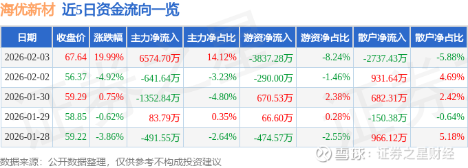 证券之星消息,海优新材2月3日涨停收盘,收盘价67.64元。该股于13点13分涨停,6次打开涨停,截止收盘封单资金为27.77万元,占其流通市值0.0%。
