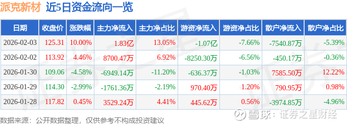 证券之星消息,派克新材2月3日涨停收盘,收盘价125.31元。该股于10点32分涨停,1次打开涨停,截止收盘封单资金为1.0亿元,占其流通市值0.66%。