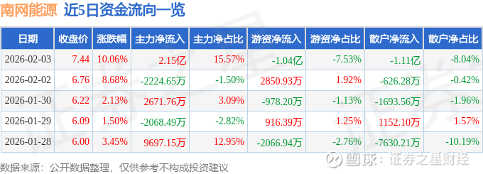证券之星消息,南网能源2月3日涨停收盘,收盘价7.44元。该股于10点23分涨停,未打开涨停,截止收盘封单资金为9234.63万元,占其流通市值0.33%。