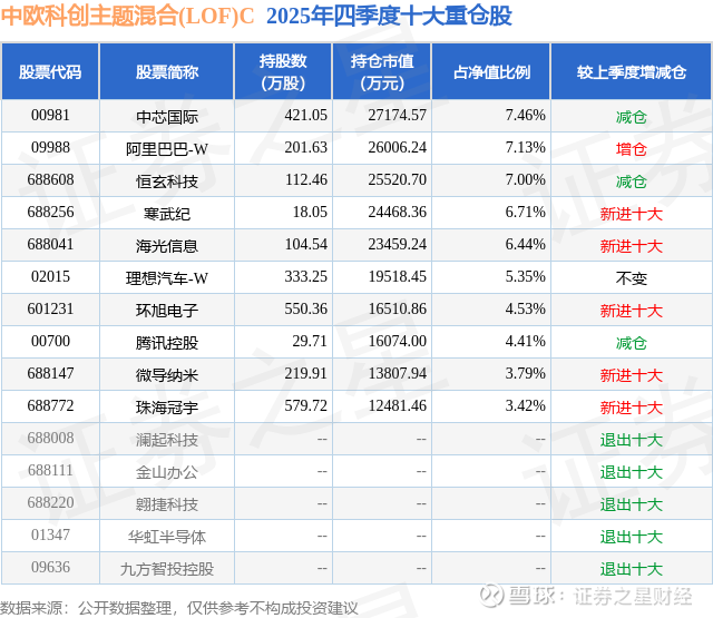 中欧科创主题混合(LOF)C的前十大重仓股如下: