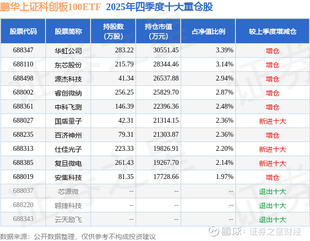 根据2025基金年报公募基金重仓股数据,重仓该股的公募基金共35家,其中持有数量最多的公募基金为鹏华基金的鹏华上证科创板100ETF。鹏华上证科创板100ETF目前规模为90.15亿元,最新净值1.4951(2月2日),较上一交易日下跌4.65%,近一年上涨65.24%。该公募基金现任基金经理为苏俊杰。苏俊杰在任的基金产品包括:鹏华沪深300指数增强A,管理时间为2021年3月5日至今,期间收益率为15.48%;鹏华中证500指数增强A,管理时间为2022年1月11日至今,期间收益率为60.11%;鹏华沪深300ETF联接(LOF)A,管理时间为2022年8月3日至今,期间收益率为19.87%;鹏华上证科创板50成份增强策略ETF,管理时间为2022年12月1日至今,期间收益率为79.14%。