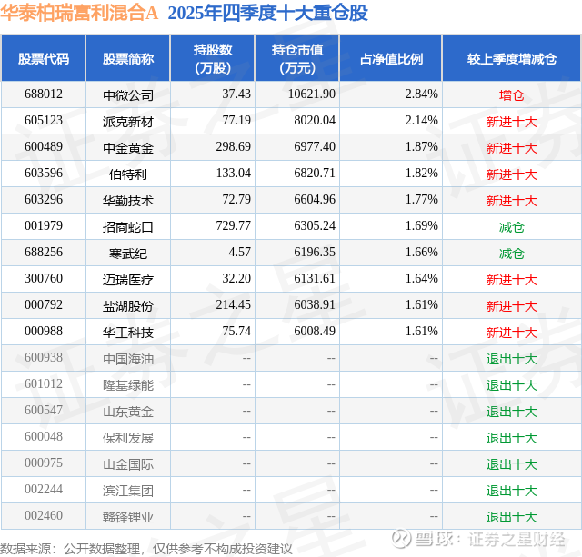 华泰柏瑞富利混合A的前十大重仓股如下: