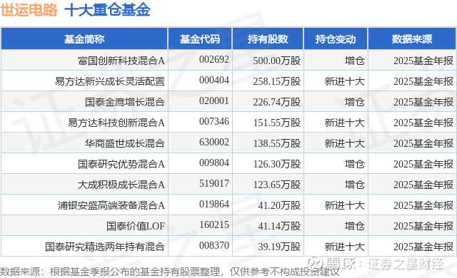 重仓世运电路的前十大公募基金请见下表: