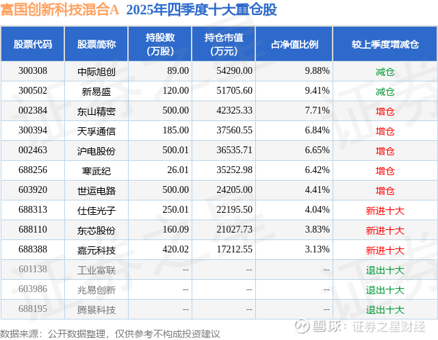 根据2025基金年报公募基金重仓股数据,重仓该股的公募基金共40家,其中持有数量最多的公募基金为富国基金的富国创新科技混合A。富国创新科技混合A目前规模为37.36亿元,最新净值2.946(2月2日),较上一交易日下跌2.74%,近一年上涨132.15%。该公募基金现任基金经理为罗擎。罗擎在任的基金产品包括:富国数字经济混合A,管理时间为2026年1月19日至今,期间收益率为nan%。