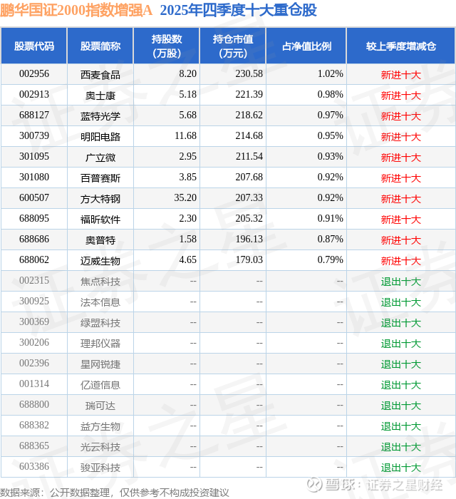 根据2025基金年报公募基金重仓股数据,重仓该股的公募基金共1家,其中持有数量最多的公募基金为鹏华基金的鹏华国证2000指数增强A。鹏华国证2000指数增强A目前规模为0.93亿元,最新净值1.6824(2月2日),较上一交易日下跌2.82%,近一年上涨57.23%。该公募基金现任基金经理为苏俊杰。苏俊杰在任的基金产品包括:鹏华沪深300指数增强A,管理时间为2021年3月5日至今,期间收益率为12.77%;鹏华中证500指数增强A,管理时间为2022年1月11日至今,期间收益率为53.3%;鹏华沪深300ETF联接(LOF)A,管理时间为2022年8月3日至今,期间收益率为17.47%;鹏华上证科创板50成份增强策略ETF,管理时间为2022年12月1日至今,期间收益率为72.24%。