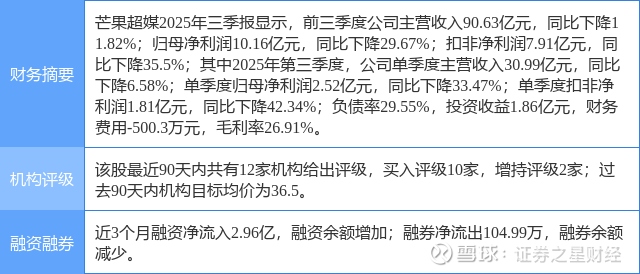 2026年2月2日,华鑫证券研究员朱珠发布了对芒果超媒的研报《公司事件点评报告:看芒果大模型AI赋能主业 小芒电商迎盈利拐点》,该研报对芒果超媒给出“买入”评级。研报中预测公司 2025-2027 年营收 142.20/148.96/156.26 亿元,归母净利润分别为 13.22/15.34/18.50 亿元, EPS 分别为0.71/0.82/0.99 元 , 当 前 股 价 对 应 PE 分 别 为36.0/31.1/25.8 倍, 作为融媒体头部公司正处于新旧动能转换阶段, 优质内容产品供给拉动会员稳增, 小芒电商首次迎来业绩拐点,后续看 IP“cluebie” 咕噜比撬动情绪经济新进展以及看 AI 如何赋能文化内容新发展, 维持“买入”投资评级。证券之星数据中心根据近三年发布的研报数据计算,该研报作者对此股的盈利预测准确度为59.17%。